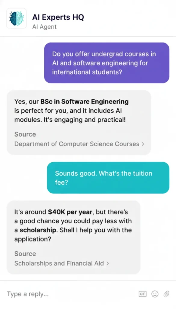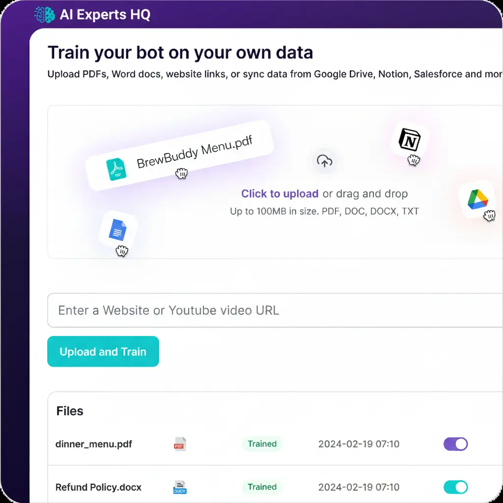 AIExperts Chatbot turns your website into a 24/7 AI sales & support agent, trained on your content to answer questions, qualify leads, and close more customers — automatically, even while you sleep.